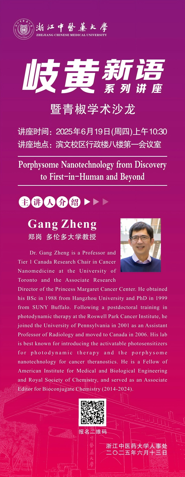 Dr. Gang Zheng is a Professor and Tier 1 Canada Research Chair in Cancer Nanomedicine at the University of Toronto and the Associate Research Director of the Princess Margaret Cancer Center. He obtained his BSc in 1988 from Hangzhou University and PhD in 1999 from SUNY Buffalo. Following a postdoctoral training in photodynamic therapy at the Roswell Park Cancer Institute, he joined the University of Pennsylvania in 2001 as an Assistant Professor of Radiology and moved to Canada in 2006. His lab is best known for introducing the activatable photosensitizers for photodynamic therapy and the porphysome nanotechnology for cancer theranostics. He is a Fellow of American Institute for Medical and Biological Engineering and Royal Society of Chemistry, and served as an Associate Editor for Bioconjugate Chemistry (2014-2024).