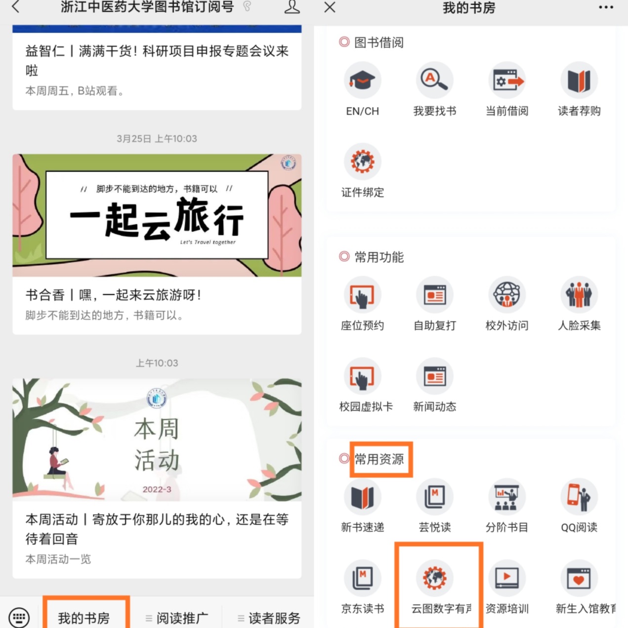 访问方式:微信关注久久精品一区二区三区四区图书馆订阅号(zculib),点击菜单栏“我的书房”→“常用资源”→“云图数字有声图书馆,进入后点击“我的”→“点我登录”,登录后即可无限畅听;