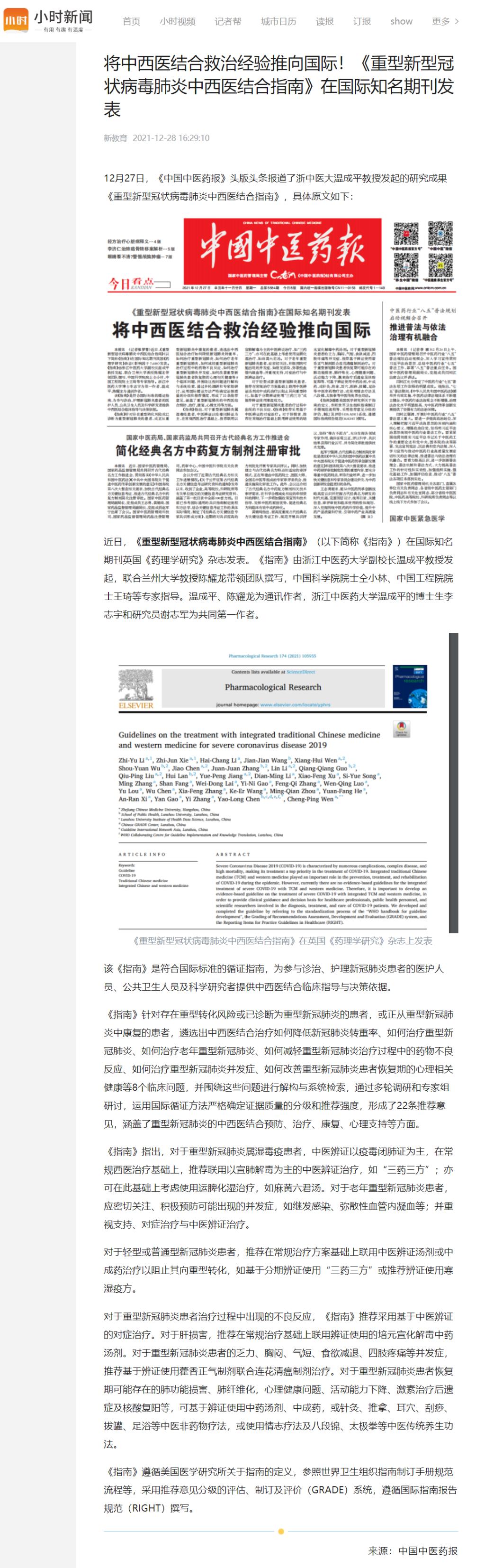 12月27日,《中国中医药报》头版头条报道了浙中医大温成平教授发起的研究成果《重型新型冠状病毒肺炎中西医结合指南》,具体原文如下: