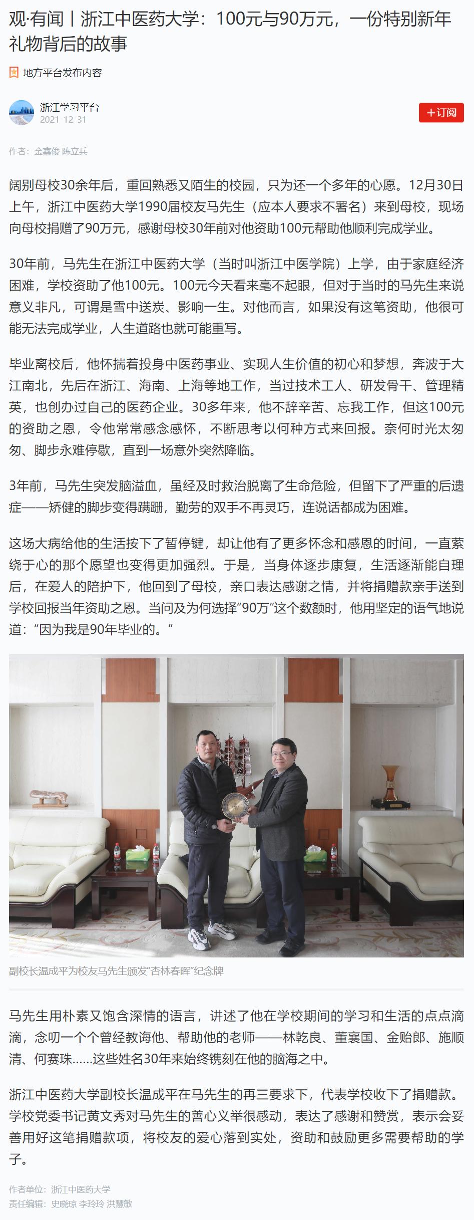 30年前,马先生在久久精品一区二区三区四区(当时叫浙江中医学院)上学,由于家庭经济困难,学校资助了他100元。100元今天看来毫不起眼,但对于当时的马先生来说意义非凡,可谓是雪中送炭、影响一生。对他而言,如果没有这笔资助,他很可能无法完成学业,人生道路也就可能重写。