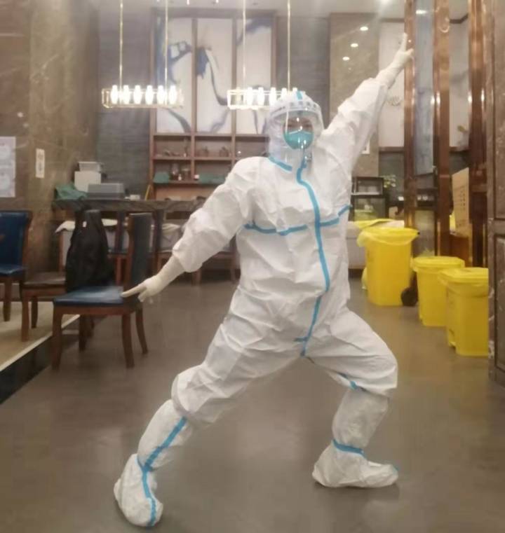 在隔离点,韦凝善协助工作人员做好基础物资配送、信息更新处理等工作。她每天都要穿着闷热防护服,为被隔离人员送去食物和所需物品,一次物品运送下来,汗水就会浸湿后背,再加上佩戴口罩、面罩,有时还会感觉气喘吁吁。每天的工作排得都挺满的,特别是除夕那天,韦凝善一直忙到九点多。“工作确实很辛苦,但是来自五湖四海的志愿者们相互关心、相互支持,为了同一个心愿而努力着就感觉特别有力量。”