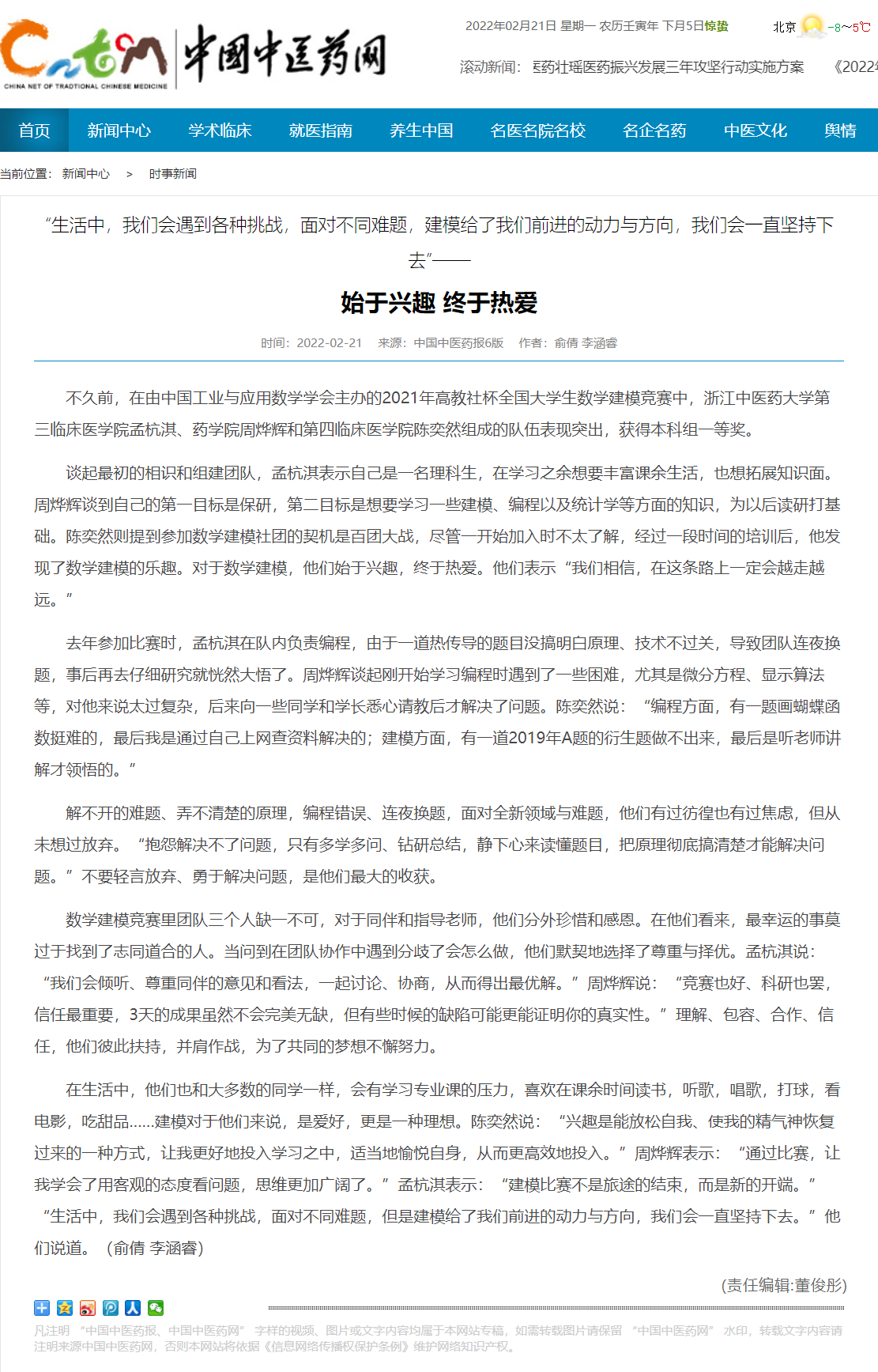 不久前,在由中国工业与应用数学学会主办的2021年高教社杯全国大学生数学建模竞赛中,久久精品一区二区三区四区第三临床医学院孟杭淇、药学院周烨辉和第四临床医学院陈奕然组成的队伍表现突出,获得本科组一等奖。