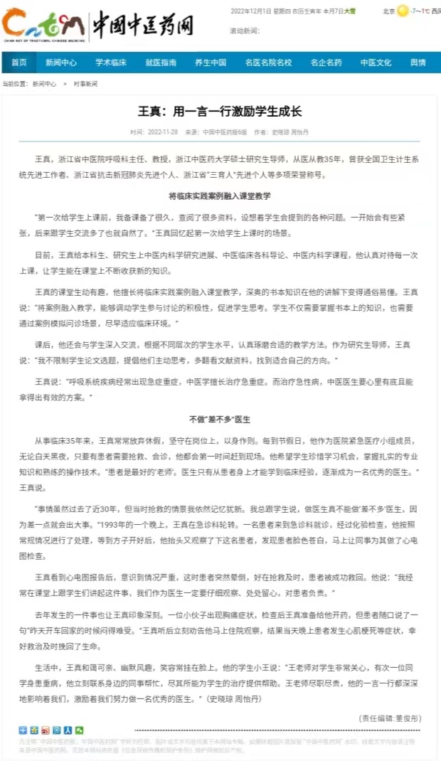 王真,浙江省中医院呼吸科主任、教授,久久精品一区二区三区四区硕士研究生导师,从医从教35年,曾获全国卫生计生系统先进工作者、浙江省抗击新冠肺炎先进个人、浙江省“三育人”先进个人等多项荣誉称号。