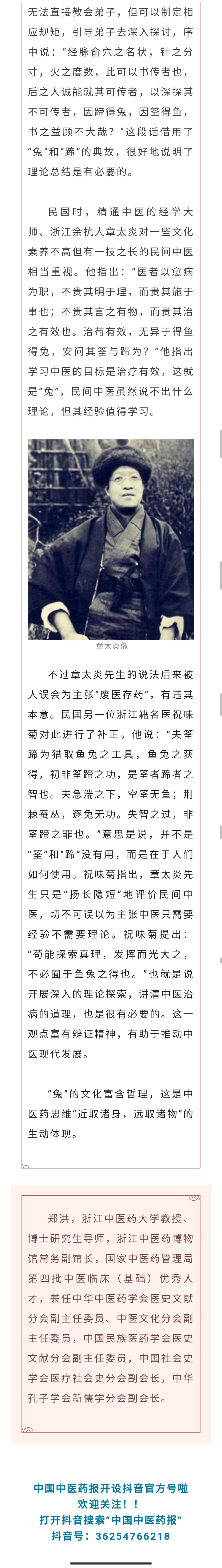 民国时,精通中医的经学大师、浙江余杭人章太炎对一些文化素养不高但有一技之长的民间中医相当重视。他指出:“医者以愈病为职,不贵其明于理,而贵其施于事也;不贵其言之有物,而贵其治之有效也。治苟有效,无异于得鱼得兔,安问其筌与蹄为?”他指出学习中医的目标是治疗有效,这就是“兔”,民间中医虽然说不出什么理论,但其经验值得学习。