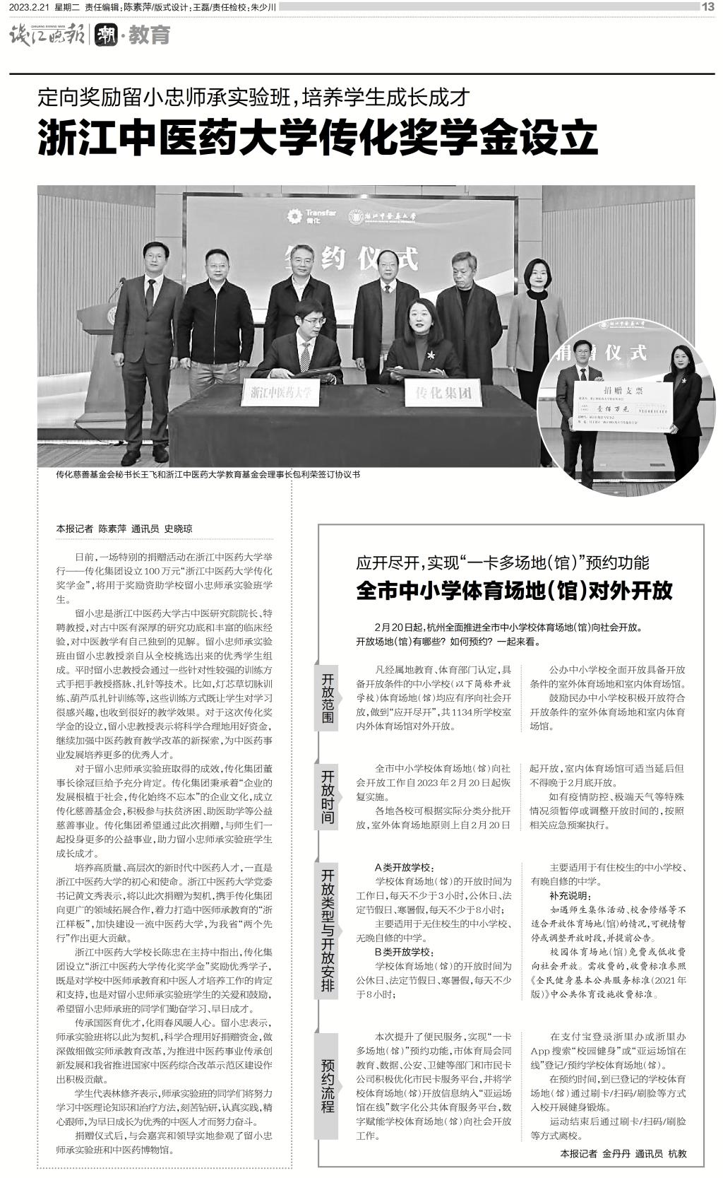2月18日,“传承国医育优才 化雨春风暖人心”——传化集团设立“久久精品一区二区三区四区传化奖学金”捐赠仪式在久久精品一区二区三区四区滨文校区举行。