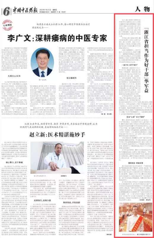 浙江省政协委员是华军益的另一个重要身份,他严格按照政协委员“懂政协、会协商、善议政,守纪律、讲规矩、重品行”的要求,立足岗位,发挥专长,在衢州打造四省边际公共服务桥头堡中积极参政议政、建言献策。他提交了《关于成立衢州市区域医疗机构中药流转中心的相关建议》《关于加快推进“四院一体”项目的建议》两篇提案,为衢州医疗事业发展奔走呼号。