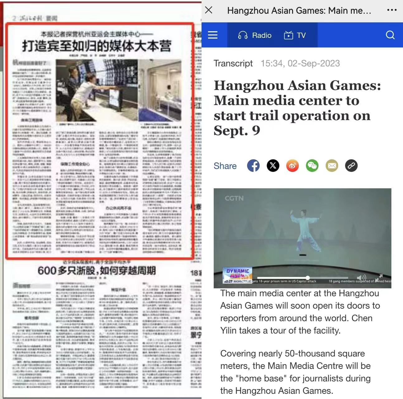 央视英语频道(CGTN):Hangzhou Asian Games: Main media center to start trail operation on Sept. 9