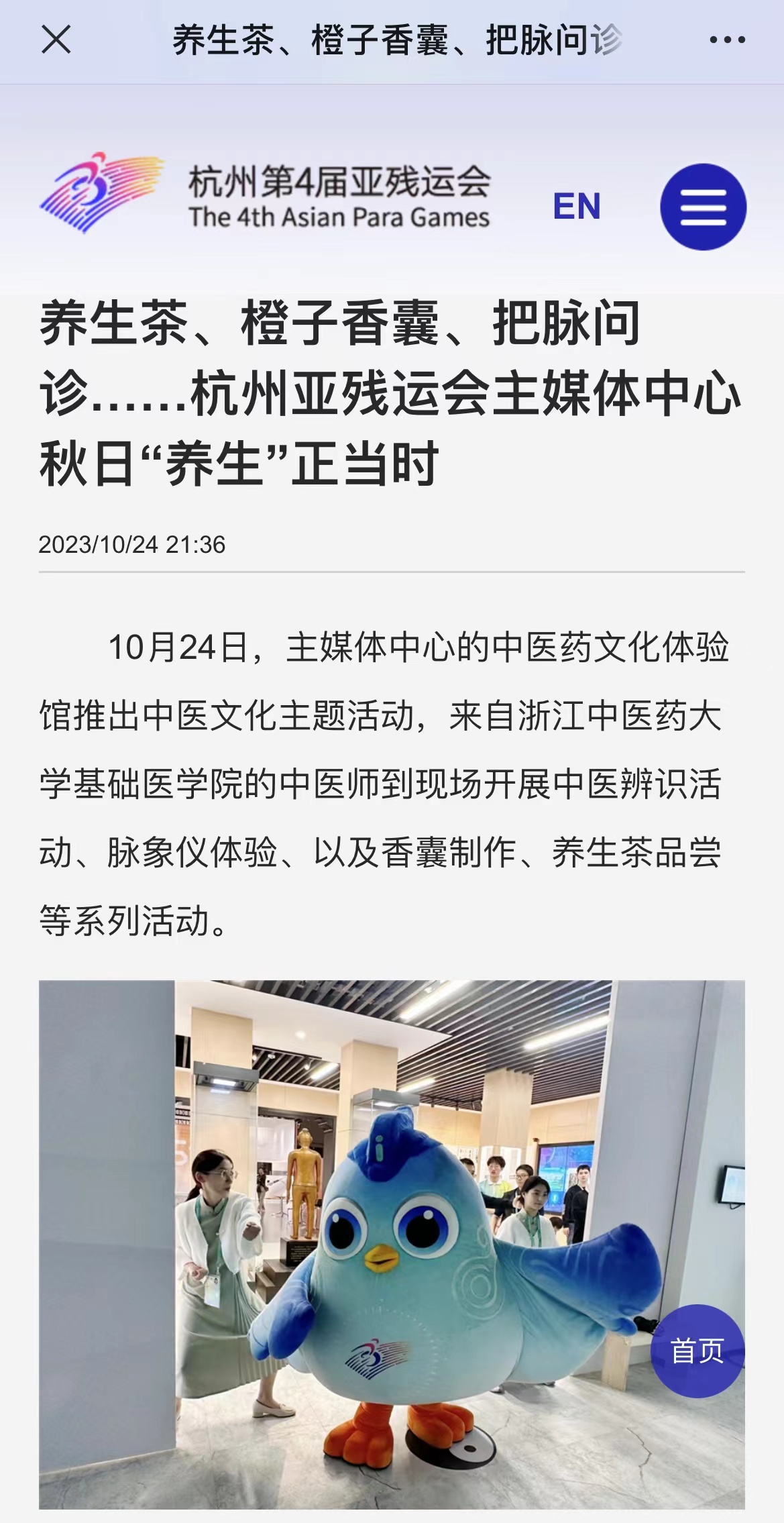 杭州网:养生茶、橙子香囊、把脉问诊……杭州亚残运会主媒体中心秋日“养生”正当时