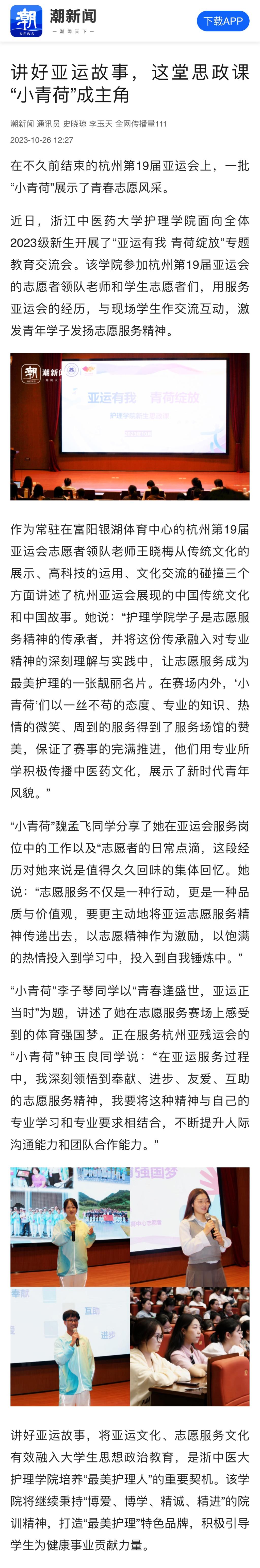 讲好亚运故事,将亚运文化、志愿服务文化有效融入大学生思想政治教育,是浙中医大护理学院培养“最美护理人”的重要契机。该学院将继续秉持“博爱、博学、精诚、精进”的院训精神,打造“最美护理”特色品牌,积极引导学生为健康事业贡献力量。