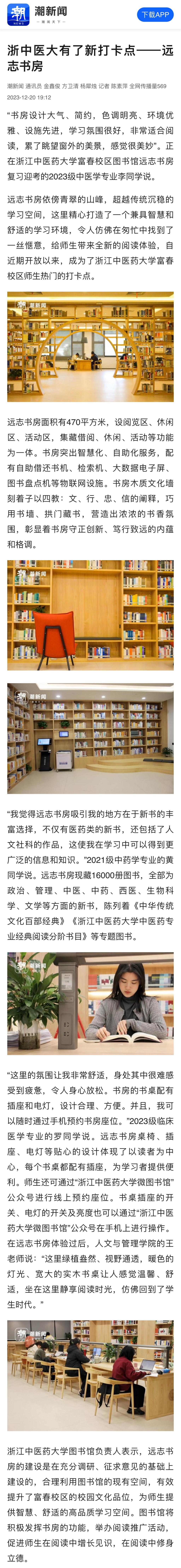 “书房设计大气、简约,色调明亮、环境优雅、设施先进,学习氛围很好,非常适合阅读,累了眺望窗外的美景,感觉很美妙”。正在久久精品一区二区三区四区富春校区图书馆远志书房复习迎考的2023级中医学专业李同学说。