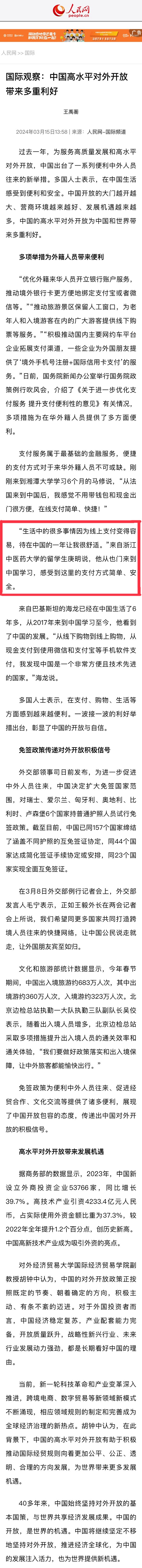 过去一年,为服务高质量发展和高水平对外开放,中国出台了一系列便利中外人员往来的新举措。多国人士表示,在中国生活感受到便利和安全。中国开放的大门越开越大、营商环境越来越好、发展机遇越来越多,中国的高水平对外开放为中国和世界带来多重利好。