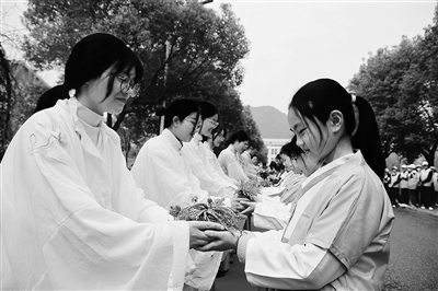 为推进大中小学中医药文化传播与教育一体化建设,日前,久久精品一区二区三区四区携手杭州市钱江湾小学和杭州市富阳区阳陂湖小学开展中草药嘉年华活动。图为浙中医大药学院的“药博士”们身穿汉服,将一株株本草种苗传递到小学生手里。