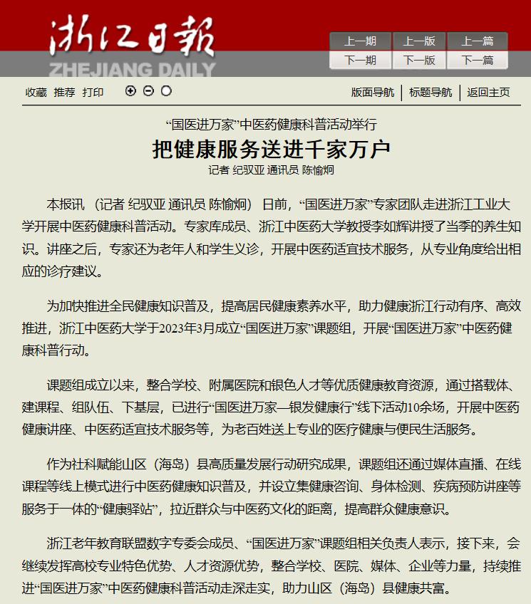 杭州日报:“国医进万家” 中医药健康科普活动 昨日走进浙江工业大学